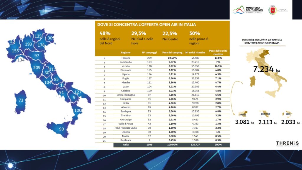 Si è svolta a Chianciano Terme la prima Conferenza programmatica sul turismo il 28 e 29 ottobre con ospiti d’eccellenza e personalità da tutta Italia per discutere il futuro del turismo in Italia. Presente anche Alberto Granzotto Presidente di Faita FederCamping, la principale associazione di rappresentanza delle imprese turistico ricettive all’aria aperta che ha mostrato i numeri e la forza del comparto. Partendo da una analisi puntuale del settore infatti, il Presidente ha evidenziato come le oltre 2000 strutture, offrano più di 250.000 piazzole per mezzi specifici ed occupino un totale di 72 milioni di mq di superfici ospitanti camping e village camping, distribuiti in modo omogeneo sul territorio nazionale. La regione con il maggior numero di campeggi è la Toscana con ben 209 strutture, seguita da Lombardia con 193 e Veneto con 178 strutture.