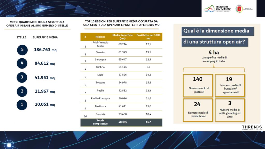 Se invece si considera dal punto di vista dimensionale, la struttura media occupa ben 4 ettari di terreno e la dimensione tende a crescere con l’elemento delle stelle, proprio perché le stelle garantiscono una maggiore disponibilità e qualità dei servizi, resi disponibili proprio dalla maggiore quantità di spazio. Per quanto riguarda l’attenzione al cliente e la sostenibilità ambientale, c’è un forte impegno da parte delle strutture ha dichiarato Granzotto, ricordando poi, che i campeggi, offrono mediamente tra i 40 ed i 50 mq di spazio ad ospite all’interno delle loro strutture e che c’è una forte attenzione alla sostenibilità ambientale sia da parte delle strutture sia da parte di Faita Federcamping come dimostrato dai recenti panels presentati sull’argomento al SIA Hospitality Desing di Rimini.